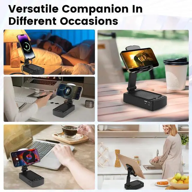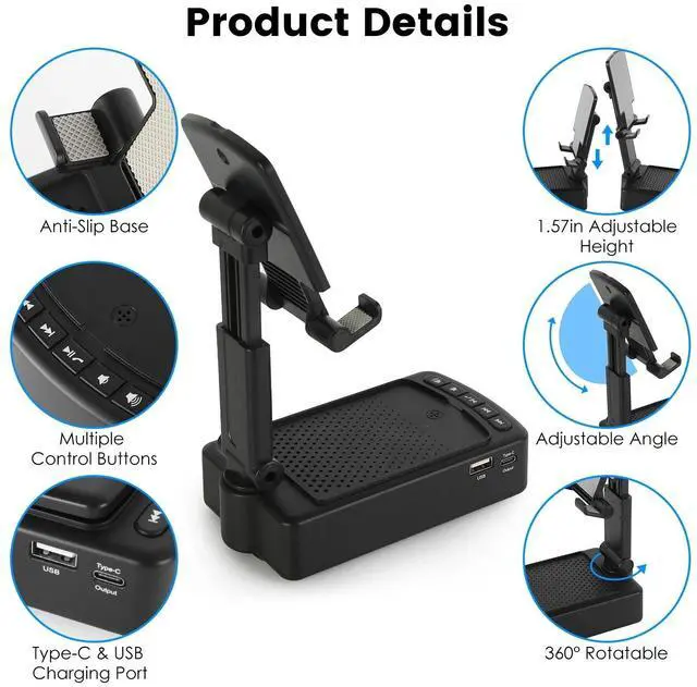 - 3-In-1 Phone Stand With Speaker:Integrated 3 diverse functions into 1 compact device,this multifunctional cell phone stand also serves as backup power bank and wireless speaker. Built-in 5W driver delivers enhanced bass,accurate mid-range frequencies and clear high sound,providing immersive sound experience. Simply press the buttons to effortlessly adjust the volume,answer/reject calls,or switch between songs.