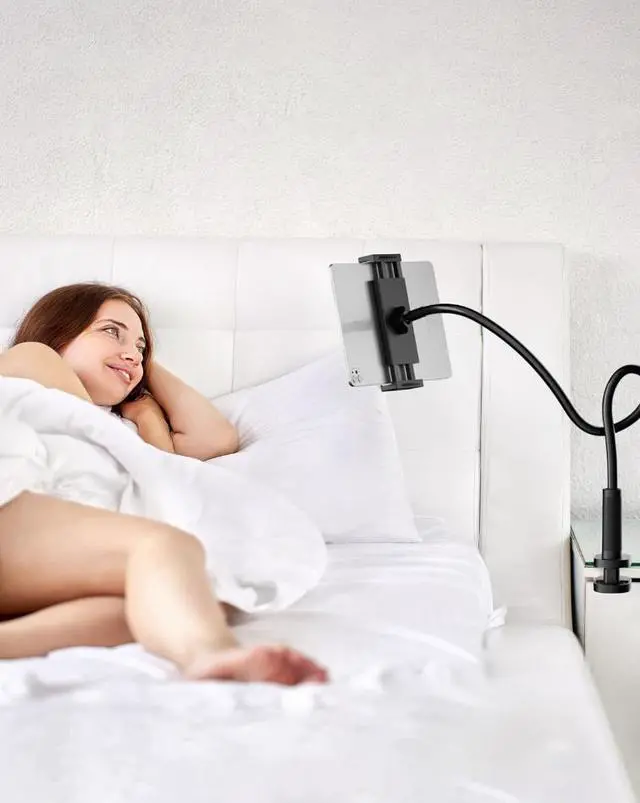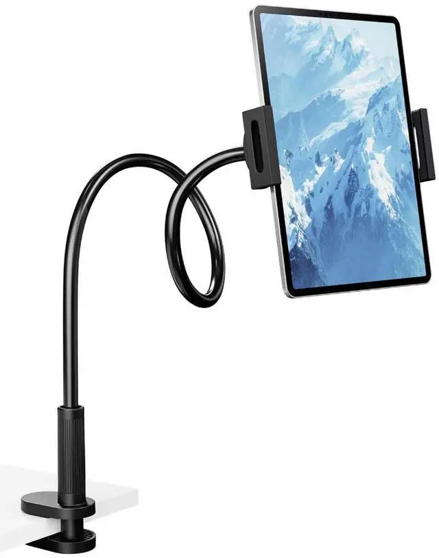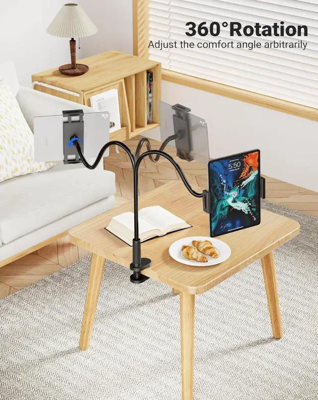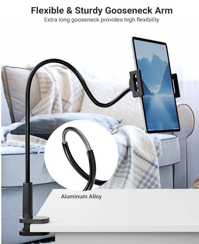 360° ADJUSTABLE GOOSENECK Stand Bend and twist the metal gooseneck to position your tablet at eye level, whether on a desk, bed, or kitchen countertop. No more neck strain! The bracket is only suitable for viewing or reading. Please do not touch the screen frequently when inserting the device.