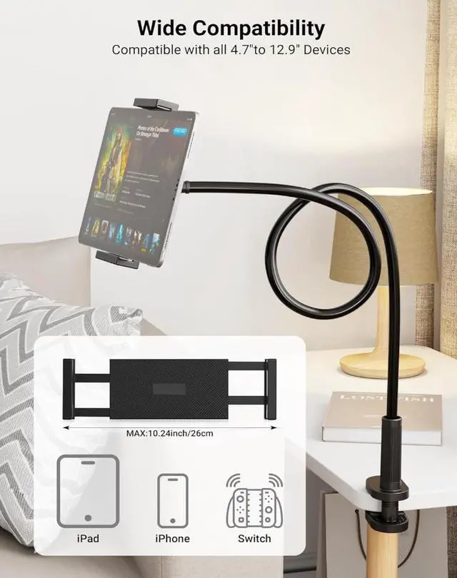 UNIVERSAL COMPATIBILITY Securely holds 4.7"-12.9" devices, including Samsung Galaxy Tab, iPad Pro, Kindle, and smartphones (with/without cases). Perfect for gaming, cooking, Zoom calls, or binge-watching!