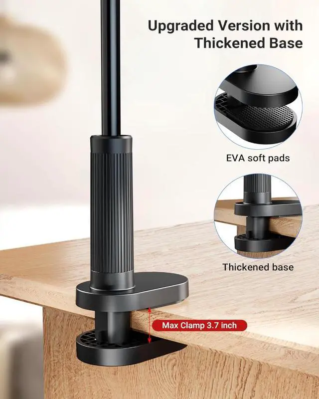 STURDY CLAMP & RUBBER PADS Heavy-duty clamp grips surfaces up to 3.7" thick (tables, headboards, treadmills) with anti-slip silicone pads to protect your furniture.