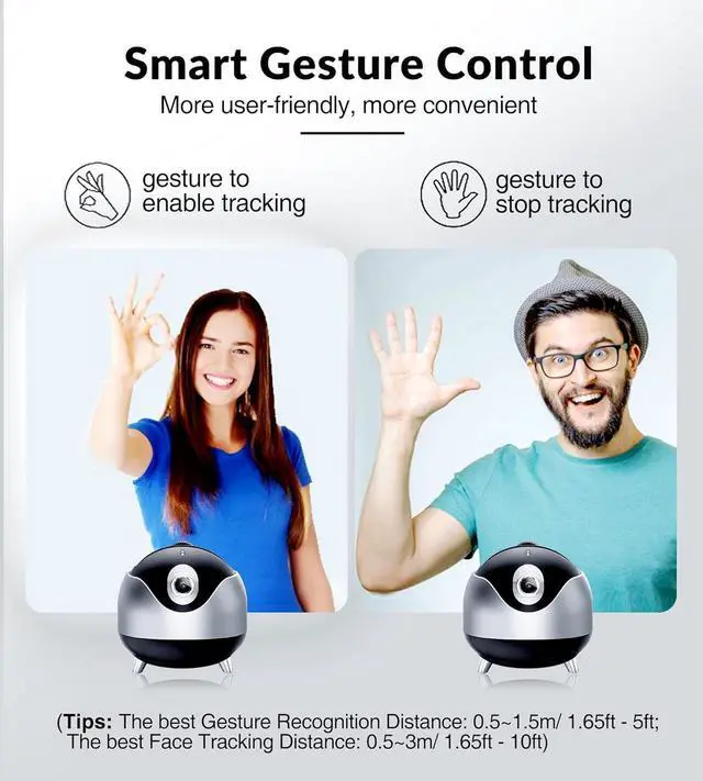 Smart Gesture Control In order to make video recording or shooting more convenient and easier, and free your hands, we added the Gesture Control function to this auto face tracking 360 tripod for cell phone rotating. Just making a " OK" gesture to enable tracking, while making the " PALM" gesture to stop tracking, and making a " Thumbs-Up" gesture to Pause/Start vertical tracking, but, the horizental tracking is normal