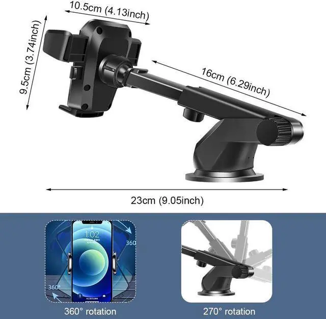 Flexible Telescopic Arm: Car phone holder features an improved telescopic arm that can be adjusted from 3.7 inches to 5.9 inches for various viewing angles. The phone holder also features a rotating 360-degree ball for increased comfort and a safer driving experience.
