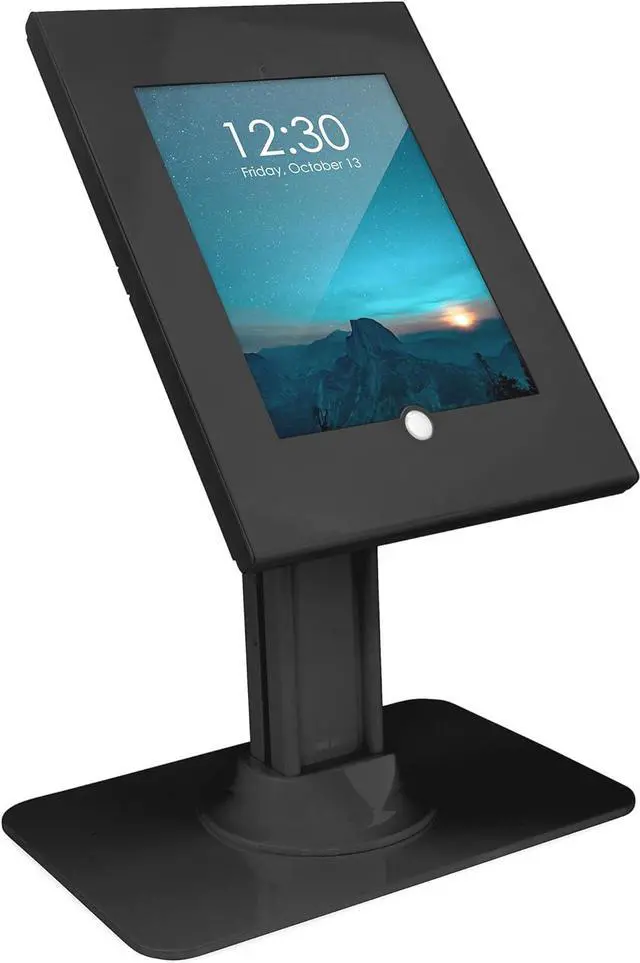 VERSATILE IN MANY WAYS: This tablet stand comes with a +/-90 degree rotating head that allows for viewing contents in either portrait or landscape orientation. In addition this lockable enclosure for iPad tablets can be tilted up to 75 degrees to adjust the angle to the user and the applicationBUILT-TO-LAST: Constructed from high-grade steel the sleek finish and slim profile keep it looking modern and aesthetically appealing for any installation or environment. You can rest assured your valuable iPad is protected even in environments with high amounts of public traffic. The free standing base ensures sturdy and stable placement on a counter and for additional security the base can be bolted down.