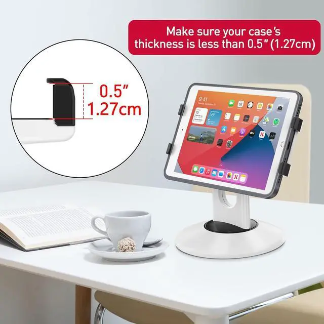 Highly flexible - The 360° rotatable base and tablet bracket holder combined with a folding arm offer unparalleled adjustment for typing or showcasing without missing any viewing angles. Turn display in a second between cashier and shopper or switch landscape/portrait mode instantly. Business-oriented - Two size rubber padded bracket holders collectively fit 6 - 13 tablets or any gadgets with width or height measurement in the range of 6.6 - 9.6 (Please noticed that both two clips fit cases less than 0.5 thickness) An ideal docking station stand for perfect match of large or small tablet pcs typically used at restaurant shop point of sale office home desk etc.