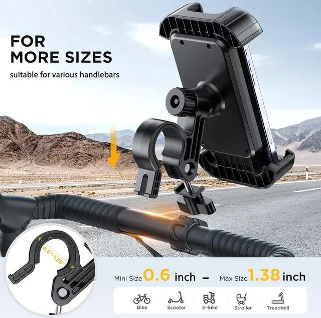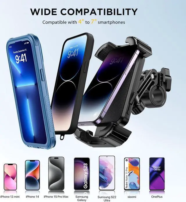 MOBILE PHONES: Our bicycle phone mount fits for 4.7 and 6.7 inches with thickness up to 0.71 " (including phone case), like iPhone 15/14/ 13/ 12/ 11 Pro Max, Pro, iPhone 15 Plus, iPhone Xs, iPhone XR, X, 8 Plus 7 6s 6, Note 9, LG and more smartphone.