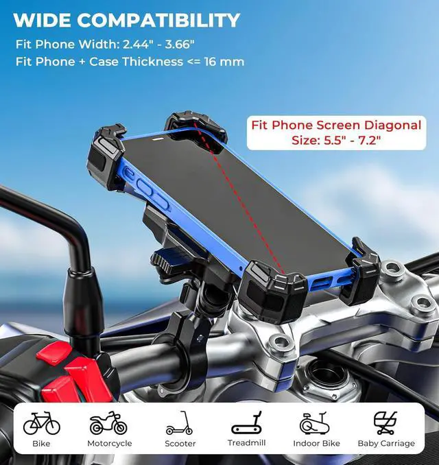 universal Compatibility: By adjusting the screws at the bottom of the cell phone holder, you can match different widths of cell phones. The motorcycle phone mount is suitable for cell phones (Case Included) with length of 135 mm - 174.5 mm( 5.31 " - 6.87 " ), widths of 62 mm - 93 mm( 2.44 " - 3.66 " ), compatible up to a maximum thickness of 16 mm( 0.63 " ), and compatible with phone screen diagonal size of 5.5 " - 7.2 "