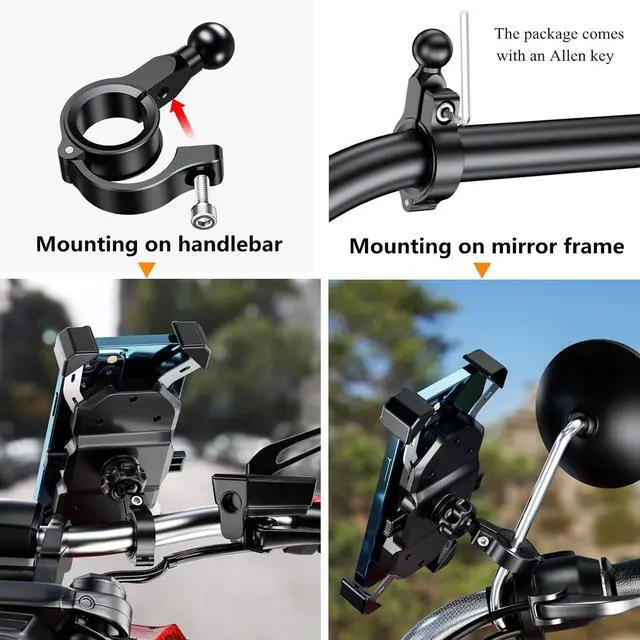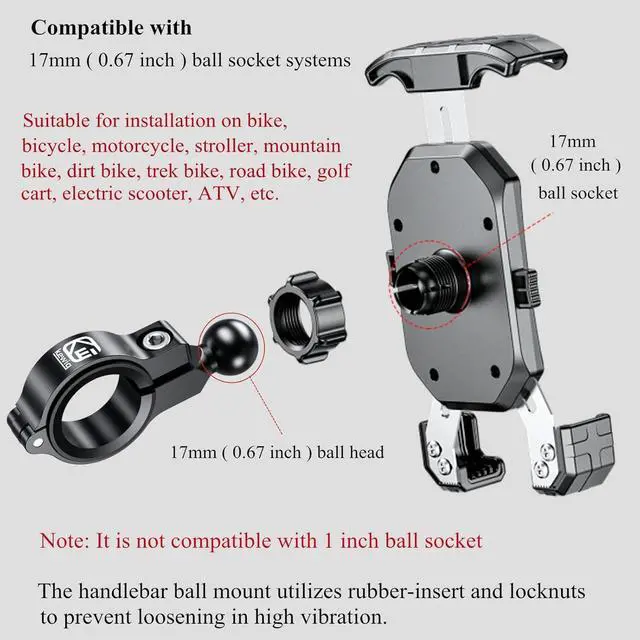 The handlebar ball mount utilizes rubber-insert and lock-bolt to prevent loosening in high vibration for mounting to motorcycle & bike handlebars and rear-view mirror as well as other round rails within the stated dimensions. An Allen key is included with the package to facilitate your installation.