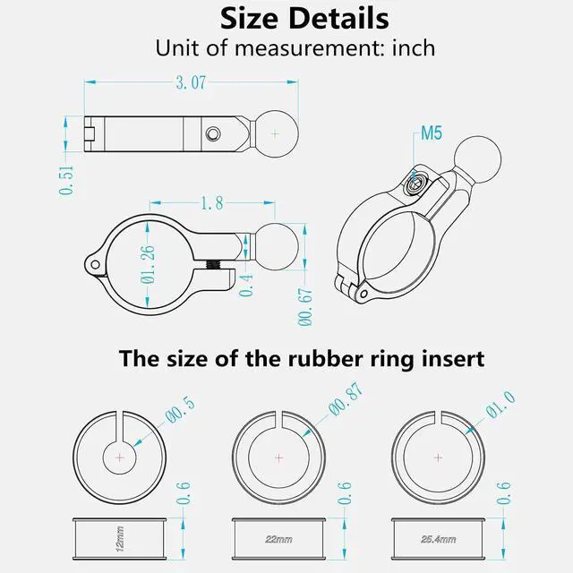 Rubber ring inserts diameter: 0.5 ' ' (12mm), 0.87 ' ' (22mm), 1' ' ( 25.4 mm). You can add or remove rubber ring according to the diameter of handlebar. When the rubber ring insert is not embedded, the hole diameter of the handlebar mounting base is 1.26 " (32mm).