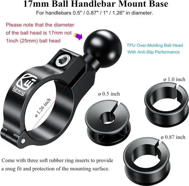 This 17mm ball handlebar clamp mount accommodates handlebars 0.5 inch (12mm) / 0.87 inch (22mm) / 1 inch ( 25.4 mm) / 1.26 inch (32mm) in diameter.