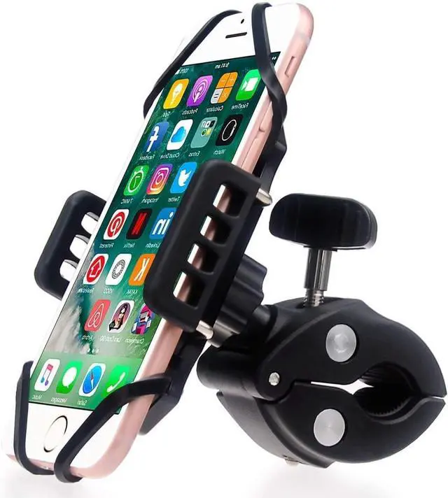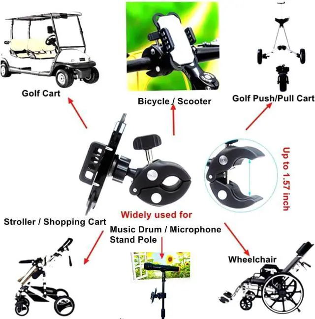 most handlebars / poles(Range: about 15 mm to 40 mm in diameter), And with non-slip / scratch-resistant silicone mats, Can hold a smartphone secure & sturdy on the handle bars / Poles of Golf Push / Pull Cart, Golf Cart Trolley, Music Drum / Microphone Mic Stand, Exercise Bike, Bicycle / Scooter, Treadmill, Stroller, Grocery / Shopping Cart, Wheelchair Walker, Boat and more