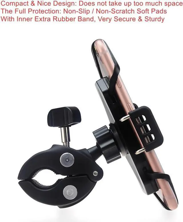 Protections: with soft non-slip and non-scratch Shockproof protection Pads & Inner Rubber Band for your Smartphone, Keeps your phone on the Handlebar sturdy & secure, Strong Clamp phone holder-your smartphone will stay firmly fastened, Don' t worry about your phone falling during use.