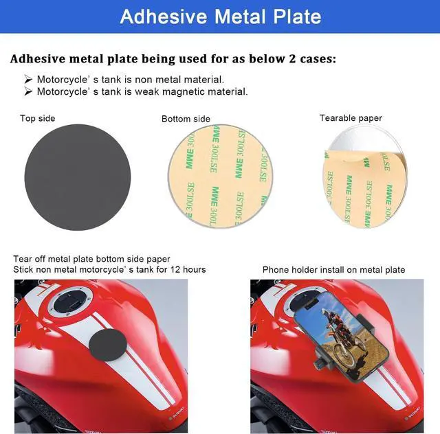 Adhesive Metal Plateif your motorbikes tank doesnt metal material or weak magnetic, we special ready for you provide to one adhesive metal plate, only need put metal plate to stick surface of motorcycle' s tank for 12 hours, then take magnetic phone stand to stick metal plate, phone holder can work for you.