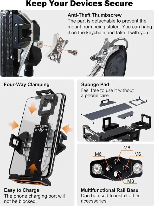 Keep Your Device Secure The high-strength holder keeps your phone firmly in position over even the roughest roads with the four-way lock structure. And the shockproof pad protects every part of your phone. Whats more, the anti-theft design will prevent your mount from being stolen.