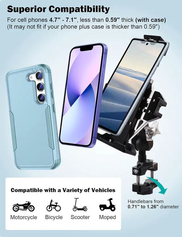 Never Need New One Constructed of durable, CNC machined, 6061 aluminum with all stainless steel hardware to offer a sturdy and reliable grip on your device. Adjustable to fit 18-32mm handlebar (Even includes most Harley-Davidson) or any tubular structure on your motorcycle. Ball and socket technology allows for near-infinite adjustability to ensure perfect view. This phone mount will accompany you in whole riding life.