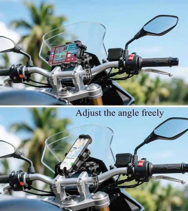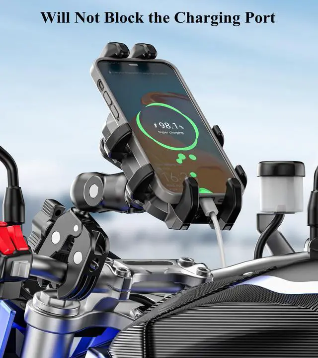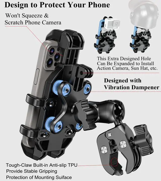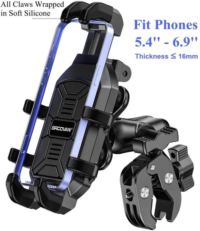 The motorcycle phone mount with vibration dampener, come with strong clamp fit for handlebars 0.5'' to 1.5'' in diameter, 720-degree rotation design, adjustable fit 5.4-6.9'' smartphones, suitable for motorcycle, bike, bicycle, scooter, ATV, UTV