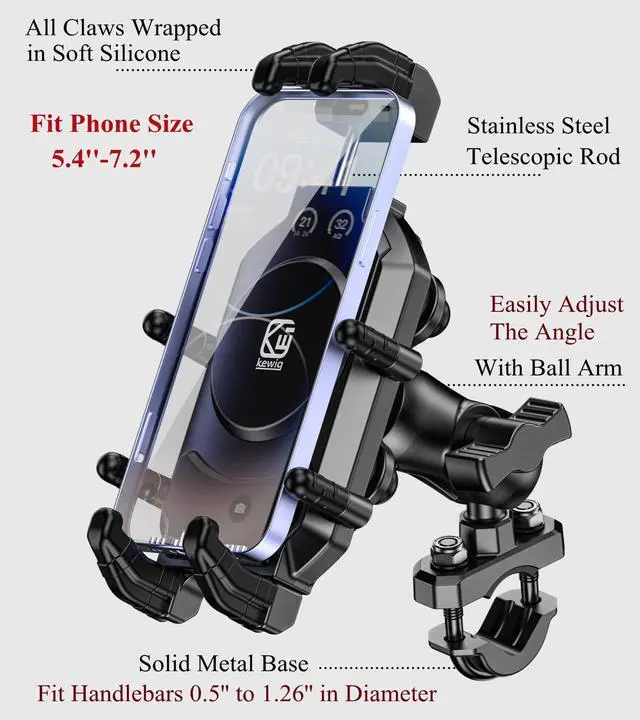 The body size of the motorcycle phone holder can be adjusted according to the size of your phone. Holds Phones (Case Included) Dimensions: Length 5.03'' (128mm) - 7.59'' (193mm), Width 2.48'' (63mm) - 3.46'' (88mm), Thickness 0.787'' (20mm ) Max. Compatible with phone screen diagonal size 5.4''-7.2''