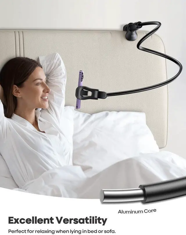 The Gooseneck cellphone holder stand is designed for people to free their hands while lying down in bed or on the sofa, cooking in the kitchen, working in the office, face chatting near the desk, or filming overhead on bed. With a 360° rotation Gooseneck clip and flexible 33.4-inch lazy long gooseneck arm made of high-quality Aluminum-magnesium alloy solid core, people can easily adjust the best phone viewing angle to their preferred position. And the gooseneck arm for bed can be bent into shape S and Z to be more stable. The bendable long Gooseneck arm holder usefully prevents people from neck pain. The adjustable clamp base varies from 0 to 3.15 inches (8cm), so the goose neck holder can be securely mounted on bed, bedside, headboard, nightstand, desk, office table, and kitchen counter, etc. This Gooseneck cell phone holder with a rubber-padded clip can be opened to a maximum of 10cm. The Gooseneck cellphone stand is widely compatible with 4-7 phones, almost all smartphone, cell phones like iPhone 17, iPhone 17 Pro, iPhone 17 Pro Max, iPhone 17 Air, iPhone 16, iPhone 16 Pro, iPhone 16 Pro Max, iPhone 16 Plus, 15, 15 pro ,15 pro max, iPhone 14, iPhone 14 Plus, iPhone 14 Pro, iPhone 14 Pro Max, iPhone 12 13 Mini, iPhone 13/ 12/ 11 Pro Max, iPhone XS, iPhone XS Max, iPhone XR, iPhone 8 7 6 5 4 3 2 1, Google Pixel, Nexus, Galaxy S23 S23+ S23 Ultra S22 S21 S20 S10, Switch, etc.As for the 33.4 inches (85cm) long arm, makes the gooseneck lazy arm sturdy enough to hold your phone, celulares firmly, yet flexible to bend Gooseneck arm in any direction to accommodate your view on bed, desk. It will be a lifesaver for protecting you from neck pain. lazy iphone holder black gooseneck phone holder bending phone holder bed smartphone holder bed screen holder gooseneck nintendo switch clip on phone holder hands free phone mount bed hands free phone holder for bed, christmas XMax gifts for mom women men dad boyfriend
