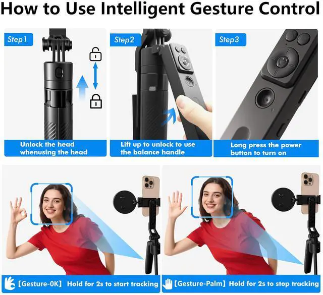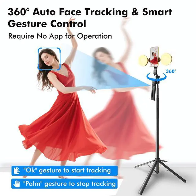 Face Tracking Tripod with Lights, No App Required, 360° Rotation Phone Stand with Rechargeable Remote Control
