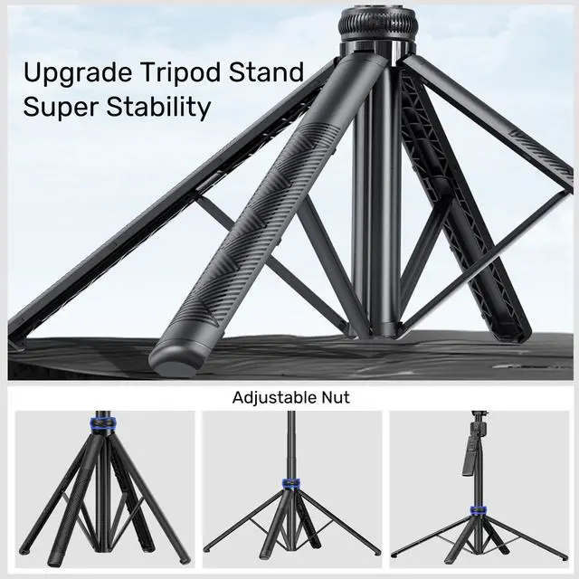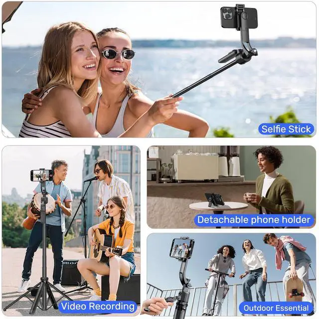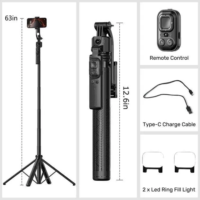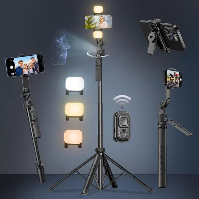 Ivbmir 3-in-1 Tripod, Selfie Stick, and Phone Holder: This versatile selfie stick tripod easily converts into a selfie stick, desktop tripod, or phone holder. It has a maximum height of 63 inches and folds compactly for convenient travel. The included phone holder is adjustable in width, accommodating smartphones from 4 to 7 inches, including iPhone and Android devices. AI Intelligent Face Tracking and Gesture Control: This selfie stick tripod features a real-time AI computing system that automatically tracks faces without needing to download an app. It can intelligently recognize and follow your face or body, ensuring you remain centered in the frame during video recordings or live streams. The advanced gesture recognition algorithm makes operation simpler: an OK gesture starts recording, while an open palm gesture pauses it. The tracking range extends up to 5 meters, suitable for various indoor and outdoor scenarios. Navigation System and Adjustable Camera: A simple press of the navigation key allows the tripod to automatically rotate 360°, making it easy to capture panoramic shots. The camera on the gimbal can be quickly switched between standing and sitting positions with a gentle push, accommodating different shooting needs. Sturdy Four-Legged Design: This tripod is made from high-quality aluminum alloy, featuring anti-slip rubber pads and adjustable screw locks for stability. It supports 270° vertical rotation and 360° horizontal rotation, making it ideal for portrait and landscape shots. The 360° rotating handle allows for easy angle adjustments, minimizing shake. The telescoping pole extends to 64.2 inches (163 cm) and collapses to 13.8 inches (35 cm), offering great portability. Perfect for close-up shots, panoramic photography, remote selfies, or phone mounting, it suits both professional photographers and everyday users. Detachable Design and Multifunctional Remote Control: The tripod includes a detachable phone holder that can be rotated for front and rear shooting. It can be quickly disassembled for use as a standalone phone holder, perfect for replying to messages, making calls, or watching videos. The selfie stick is equipped with a seven-button detachable remote, supporting remote shooting up to 33 feet (10 meters), making one-button shooting easy and ideal for personal use. Detachable LED Square Fill Lights: This motion-tracking tripod comes with two detachable mini square lights that enhance video quality in low-light conditions. The small lights have both cool and warm color modes, with a total of six brightness levels. At maximum brightness, they can last for up to 2 hours, meeting various shooting needs. Flexible 1/4 Interface: The device features a 1/4 interface, compatible with smartphones, cameras, and more, offering diverse shooting possibilities. It is the perfect companion as a phone holder, tall iPhone tripod, or camera tripod. Warm Tips: 1. Stay Stable: Our product is a facial tracking selfie stick. When using the facial tracking feature, please avoid quick movements or sudden changes in position to ensure the best tracking effect. If you move too quickly or exceed a certain distance (the optimal sensitivity for facial tracking is within 5 meters), the facial tracking function may not work properly. 2. Tripod Limitations: Please note that the camera on the current tripod only supports horizontal rotation and cannot move up and down. This means that when shooting or recording, you will need to manually adj