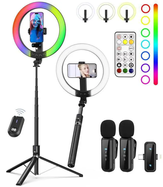 Package Includes: Ring light with tripod, phone holder, wireless mic, Bluetooth remote, fill light remote control, and Type-C cable.