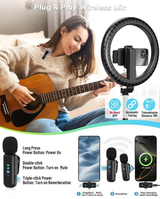Crystal-clear wireless microphone delivers pro-grade audio quality. This wireless mic captures crisp, noise-free sound with a stable 79ft transmission range, even in outdoor or noisy environments. Plug & Play: it auto-pairs instantly when turned on, with no complicated setup required. Perfect for vlogs, TikTok, YouTube, interviews, and Instagram content that demands professional audio.