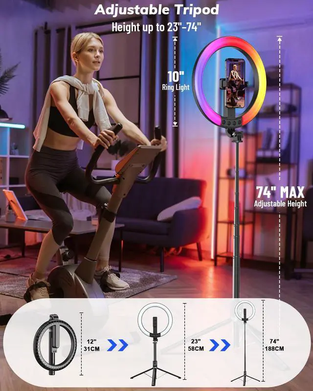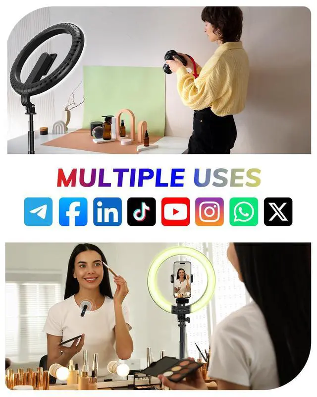 The 10" professional ring light ensures perfect lighting every time. It features 3 normal light modes (Warm/Cool/Natural) with adjustable color temperature (3000K-6500K) and 12 vibrant RGB color modes to match any scene, vibe, or creative vision. 8 brightness levels and 0-100% stepless dimming eliminate harsh shadows, ensuring soft, even lighting for flawless shots. Switch modes and adjust settings effortlessly via the intuitive touch panel or included wireless fill light remoteno need to lean in close.