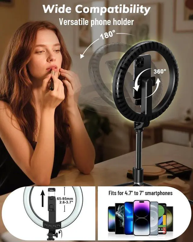 The kit includes a 74" versatile adjustable tripoddurable, lightweight, and flexible. Extending from 23" to 74", it adapts to any scenarioeasily switching between a standard tripod, selfie stick, and desktop stand, making it ideal for makeup tutorials, live streaming, or on-the-go recording. The 360° rotating Phone Holder fits 4-4.7 inch smartphones, allowing you to capture angles from any perspective. Use the included Bluetooth remote lets you start recording or snap photos from up to 33 ft no extra app required.