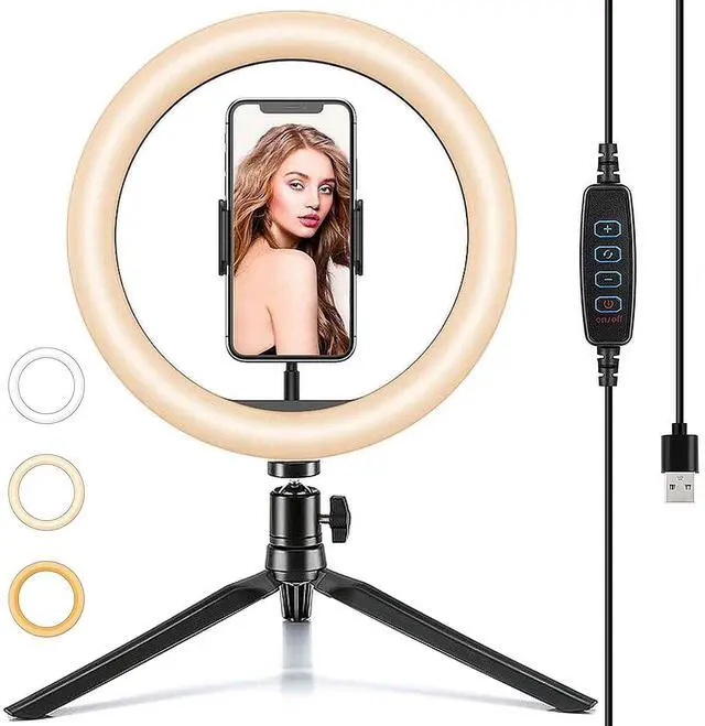 10" Ring Light with Tripod Stand for Desk for Video Recording and Makeup, Adjustable Halo Light with Cell Phone Holder Desktop LED Lamp with 3 Light Modes & 11 Brightness Level