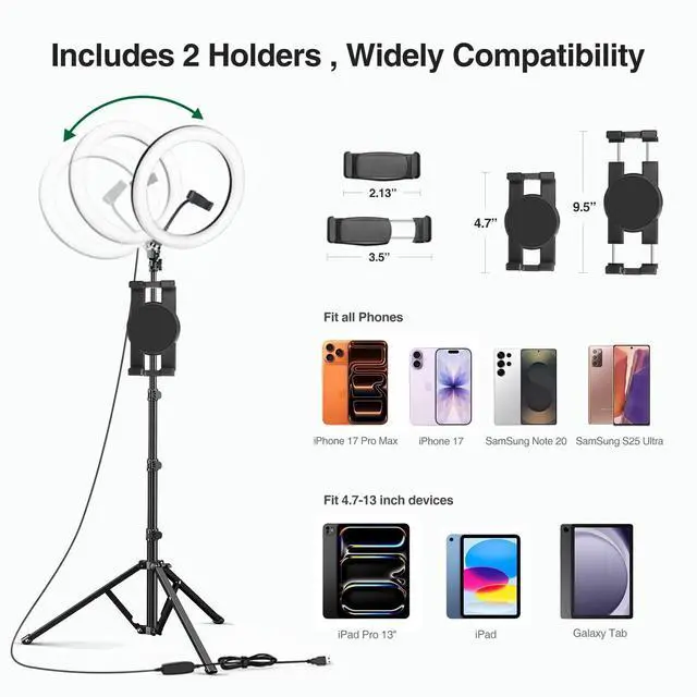 With rotatable phone holder and rotatable ball head, able to easily adjust the angle of your cell phone and the led ring light.
