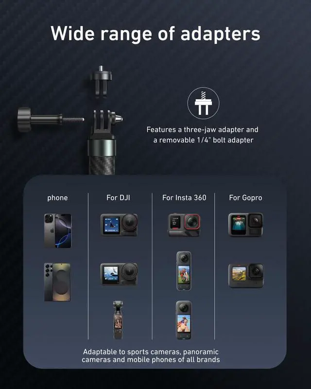 - [Great Device Compatibility] This selfie pole comes with 2 adapters, one for gopro and one for insta360 and phones, suitable for all GoPro Max Mini Hero 13 12 11 10 9 8 7 6 5 Session, DJI Osmo 360, DJI Osmo Nano, DJI Action 3 4 5 Pro 6, Osmo Pocket 2 3, Insta 360 One R RS X2 X3 X4 X5, Go2 Go3, Ace Pro 2, AKSAO, ACTION CAMS & DIGITAL COMPACTS & Smart Phones (phone clip required, NOT included). One Pole, All Your GearZero Compromises!