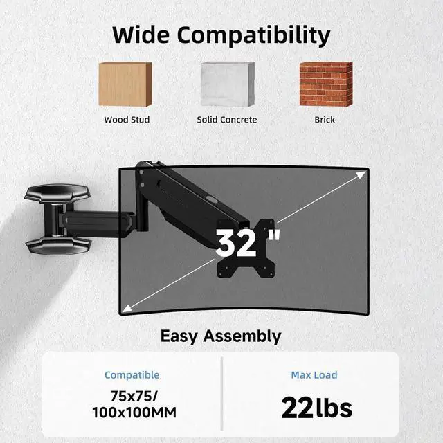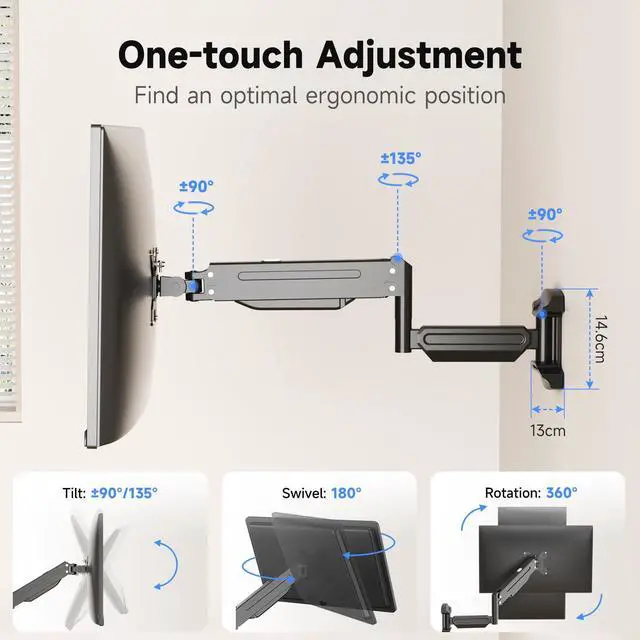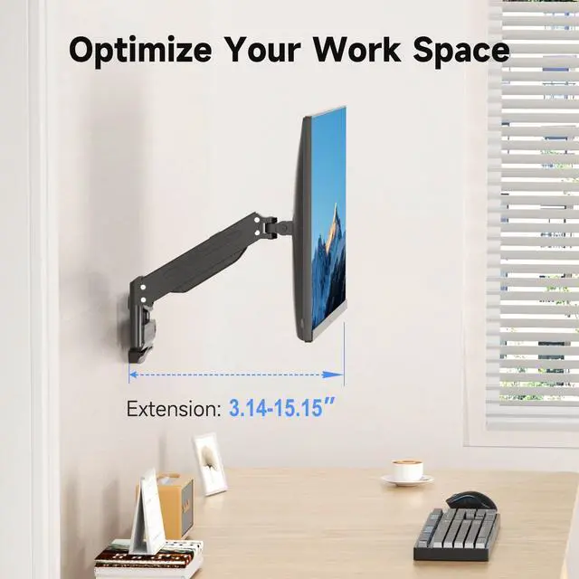 Every joint on this monitor wall mount is adjustable. The swivel, tilt, and rotation features of the articulating arm give you the flexibility to position your monitor to find the optimal viewing angle, save space on your desk and be your most productive self.