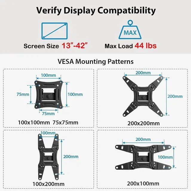 | What is VESA? | VESA refers to the distance between the four mounting holes on the back of your TV. Measure the horizontal and vertical distances in millimeters to check compatibility—this mount supports VESA patterns from 75×75 mm to 200×200 mm. |