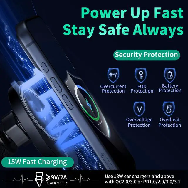 Charger & Cable RequirementsUse an 18 W+ QC 2.0/3.0 or PD 2.0/3.0/3.1 car charger and compatible cable (minimum 9 V/2 A output) for optimal performance. Slight heating during charging is normal.