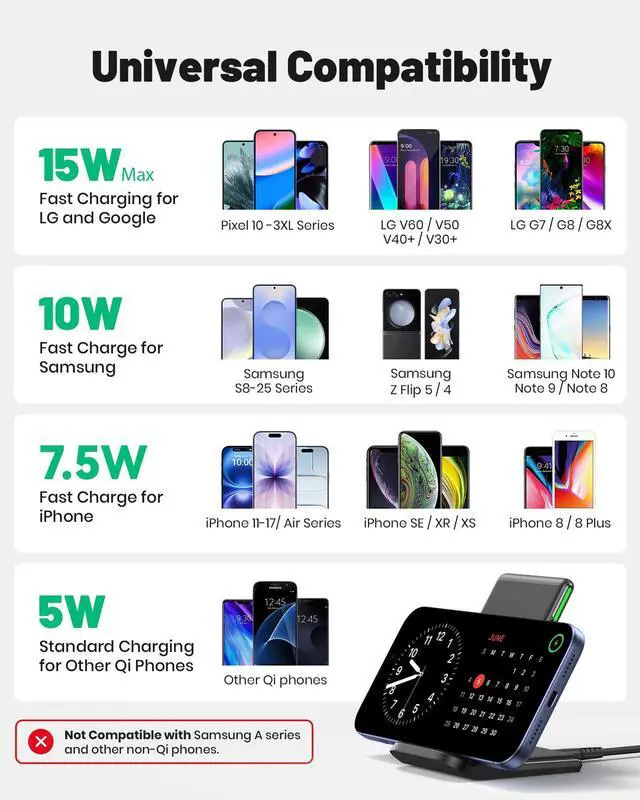 • 4 Upgraded Charging Modes: A high-efficiency chip provides 15W fast charge for LG, 10W fast charge for Samsung Galaxy, 7.5W fast charge for iPhone, and 5W standard charge for any wireless-enabled devices.