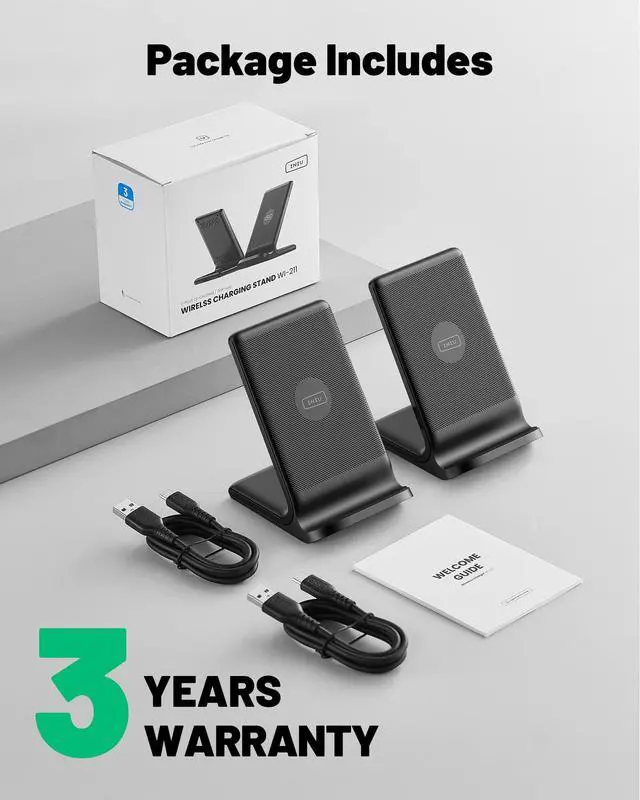 • What You Get: INIU wireless charging stand*2, USB C cable*2, welcome guide*1, 30-day money-back guarantee, industry-leading 3-Year iNiu Care, plus lifetime technical support.