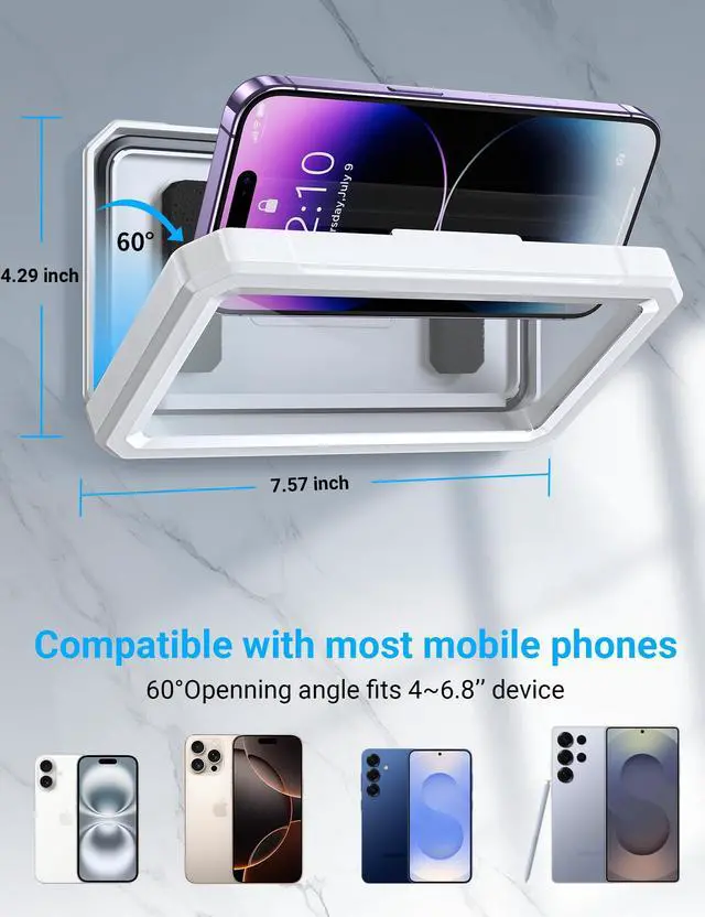 WATERPROOF & FOG-PROOF: The Shower phone holder has an IPX6 waterproof rating. It is made of high-quality eco-friendly materials such as ABS, and features a double-layer waterproof structure, combined with a built-in waterproof ring, a buckle design, and a fully enclosed storage space. This effectively resists shower splashes and water vapor intrusion. !!!Note: Please do not completely immerse the phone case holder into water