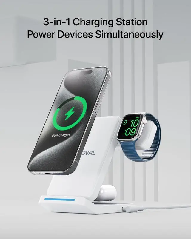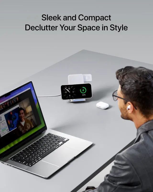The indicator lights for each charging section—blue for phones, white for watches, and green for earbuds—automatically turn off after 20 seconds to ensure a disturbance-free sleep environment.