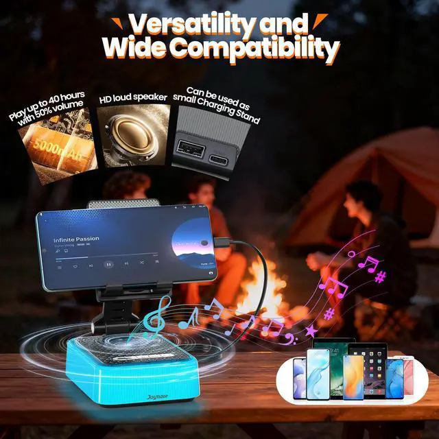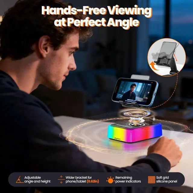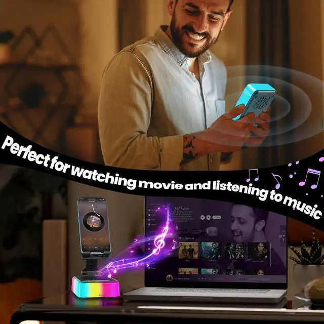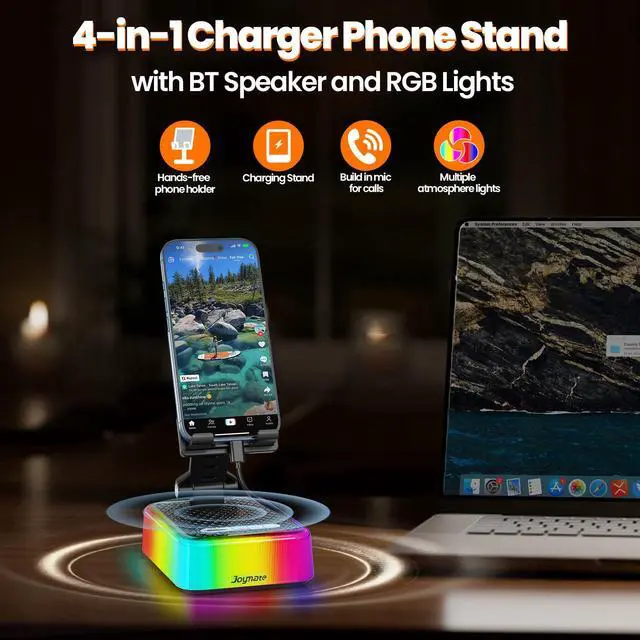 4-in-1 Charger Phone Stand with Speaker: features phone stand, Bluetooth speaker, and charging stand all in 1 design. This item comes with enhanced sound effect and rhythmic ambiance RGB lighting that creates wonderful atmosphere to enjoy music & video. An excellent gift for men and women.
