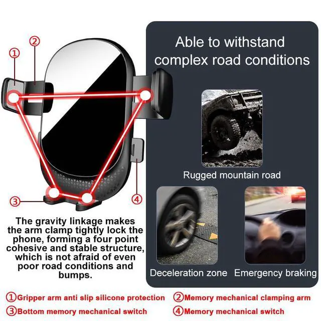 The gravity linkage makesthe arm clamp tightly lock thephone, forming a four pointcohesive and stable structure,which is not afraid of evenpoor road conditions andbumps.