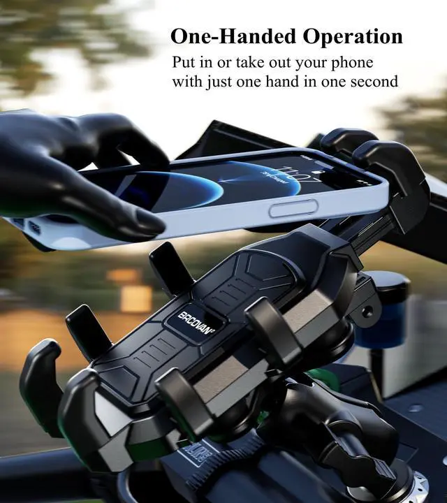 Sturdy, Anti Shake: The main body of this motorcycle phone mount is made of high-strength composite materials, providing durability and reliability in the most demanding environments. Built-in high-quality industrial springs and a special eight-claw wrapping phone design ensure that your phone is securely fixed on the motorcycle cell phone mount even when driving on bumpy roads