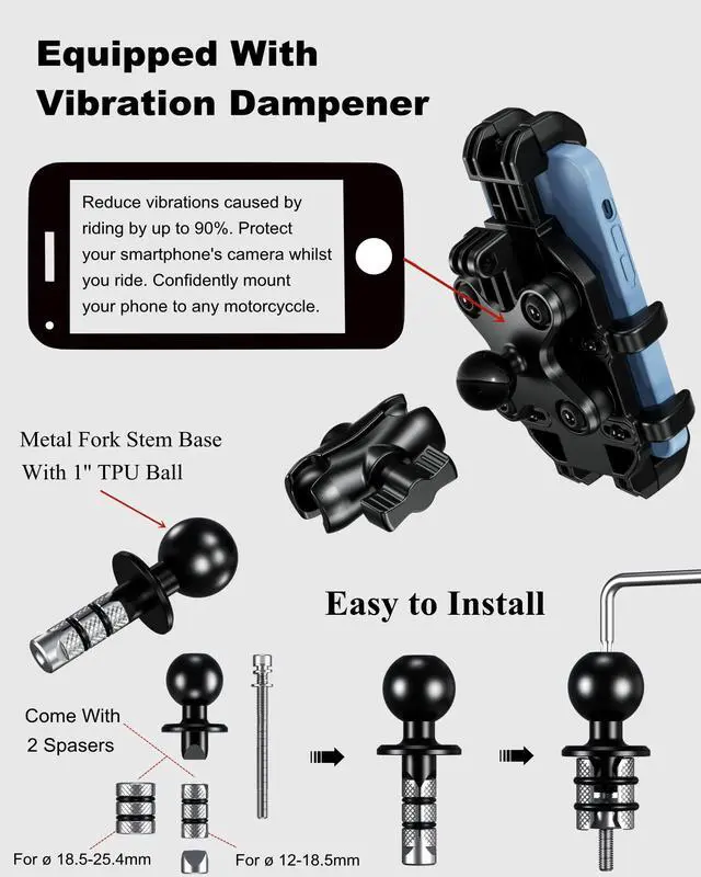 Easy to Install: Equipped with aluminum alloy fork stem mounting base. Accessories included with the package allow this motorcycle phone holder easy to attach to motorcycle fork stem tubes. The fork stem mounting base fit tubes 12mm-25.4mm in diameter