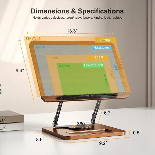 360° Adjustable Base360° rotating base with fully customizable height & angle for ideal viewing. Maintain a comfortable posture with hands-free reading via spring-loaded clips. Designed to enhance comfort during extended reading sessions