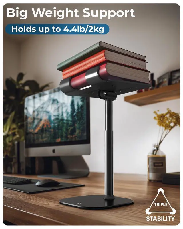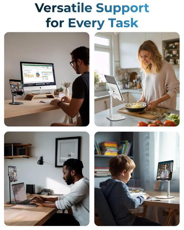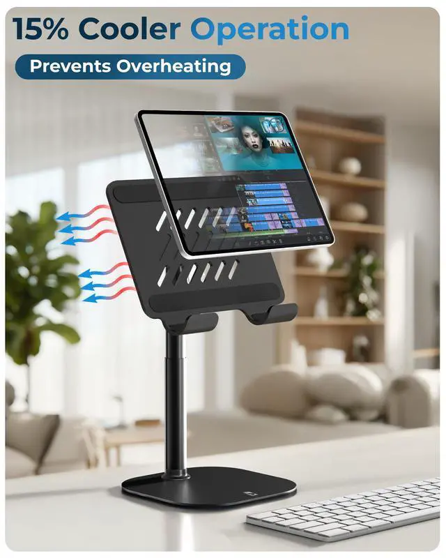 A tablet stand designed for all-day comfort with a rock-solid weighted base, 7-10 inch height adjustment, and 270° tilt positioning. Raise your screen to perfect eye level, eliminate neck strain, and switch between portrait and landscape instantly. Cooling vents prevent device overheating during extended use. Perfect tablet stand for video calls, remote work, streaming, and hands-free productivity.