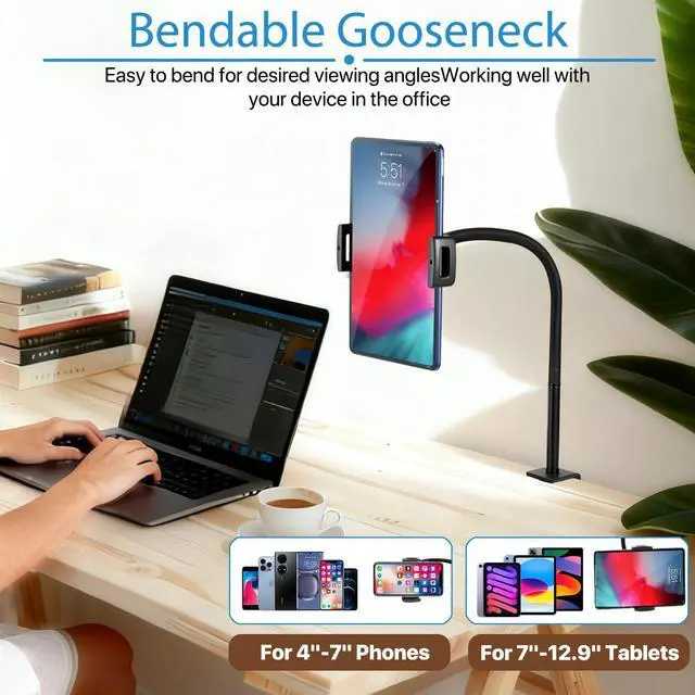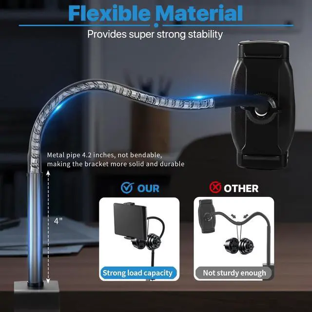 Durable and stable, focused on every moment Made of thick solid metal material, the 13.7-inch ultra long flexible gooseneck arm provides stable support without shaking. Say goodbye to the shaking troubles of plastic brackets. Whether it's typing, binge watching, or video recording, the device is always firmly fixed, helping you work efficiently, immerse yourself in learning, and focus on creation.