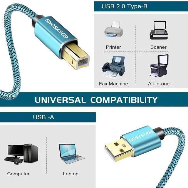 GOSYSONG Full USB printer cable 2.0 capability, 480 Mbps data transfer speed & backwards compatibility, more stable, more better security and faster data transfer speed than most Wi-Fi connections. GOSYSONG USB 2.0 Printer Cable with corrosion-resistant gold-plated connectors & foil/braid shielding, provide long-term use without noise or signal loss. It also protects against RF/EM interference, keeping a clear signal with little bandwidth loss.