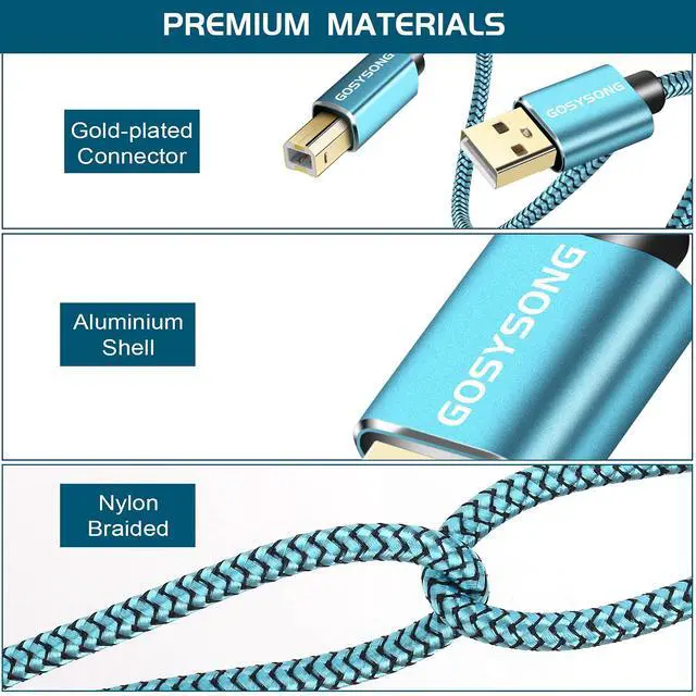 GOSYSONG Type a to b printer cable adopts to use anodized aluminum metal shell make this Printer Cable more durable, anti-corrison and sturdier.