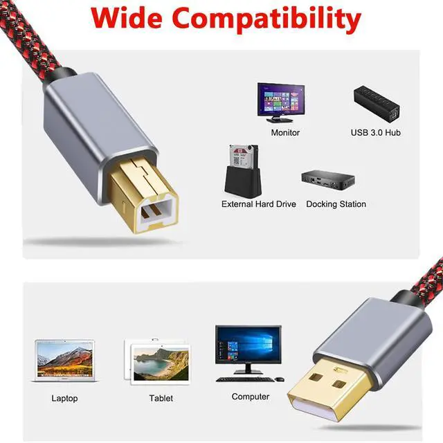 Hi-speed for Data Transfer: Up to 480 Mbps transfers data speed for USB 2.0 devices, the printer cable is backwards compliant with full-speed USB 1.1 and low-speed USB 1.0.