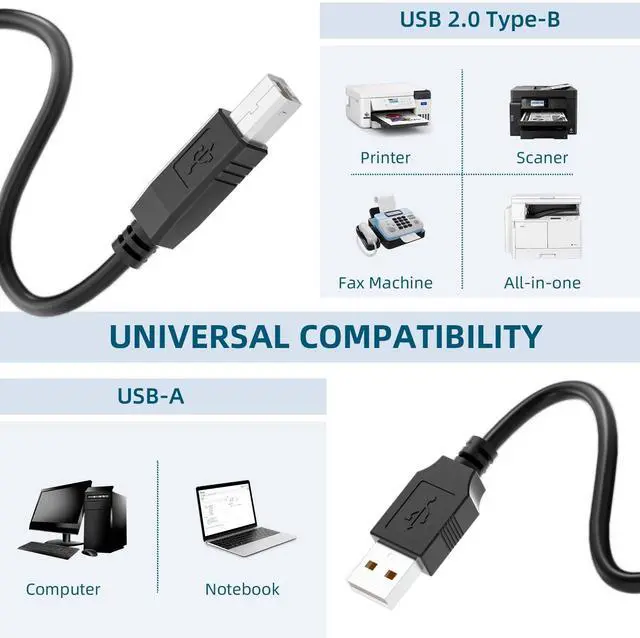 USB A to USB B Wired connection is more stable and faster than Wi-Fi connection. Ensure a more safe office space. Fully shielded provides superior transmission performance and protects against EMI/RFI noise. Flexible Connector Flexible PVC jacket and durable connector mold ensures for secure fits & easy cable handling. USB A to USB B Printer Cable High speed Data Transfer USB Printer cord supports USB 2.0 speed up to 480Mbps. Backward compatibility with USB 1.1 and USB 1.0. Stable signal connecting with printer.