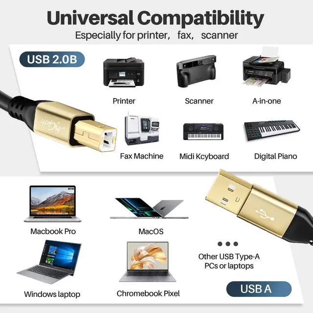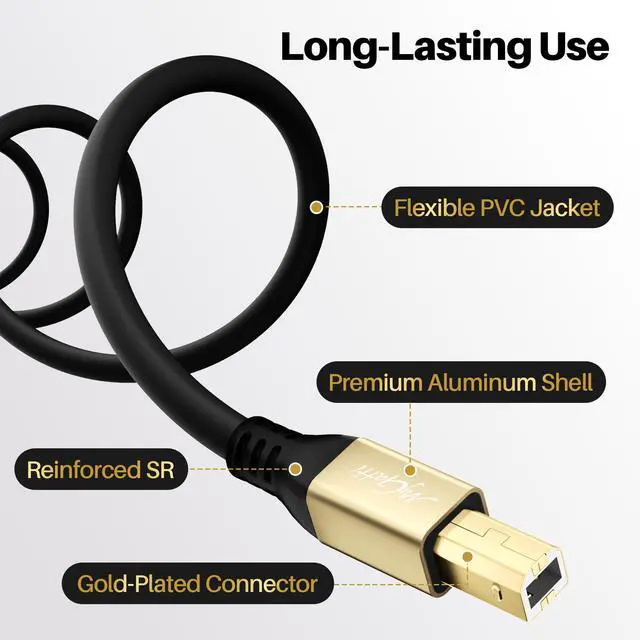 Our extra-long USB 2.0 A to USB B Cables are designed to unlock flexibility for your office, studio and home, ensuring the data transmission more stable than WIFI, USB1.1 and USB1.0.