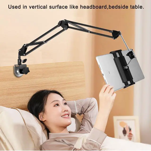 It can be used in vertical surface like headboard. Bend the arm and turn the holder to the most comfortable viewing position whether your are standing, sitting or lying in bed.